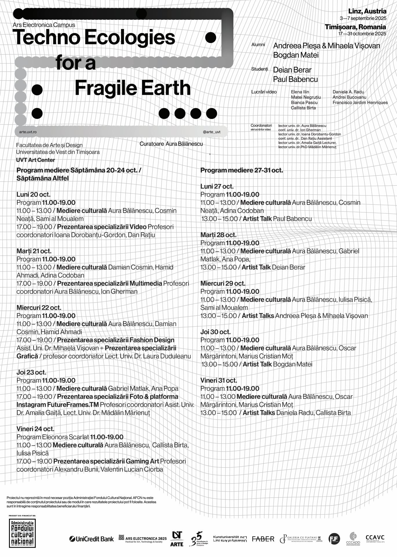 Mulțumiri sincere tuturor artiștilor participanți pentru viziune, dedicare și dialog,echipei Facultății de Arte și Design – UVT, pentru sprijinul constant și implicarea colectivă,precum și partenerilor instituționali și culturali care au făcut posibil acest proiect:Ars Electronica Linz GmbH & Co KG, Kunstuniversität Linz, Faber Timișoara, FutureFramesTm, prin organizarea Centrului de Cercetare și Creație în Artele Decorative și Design (CCCADD) și a Centrului de Creație în Artele Vizuale Contemporane (CCAVC).Mulțumim UniCredit Bank, prin Fundația Universității de Vest din Timișoara, și Administrației Fondului Cultural Național (AFCN) pentru co-finanțarea proiectului.